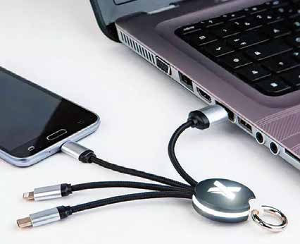 Multi-device charging cable disguised as a stylish keychain. Supports Lightning, USB-C, and Micro-USB with a single connector. Custom LED-illuminated logo lights up when charging. A practical everyday carry corporate gift.