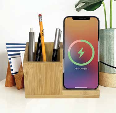 Eco-friendly bamboo desk organizer with built-in 10W wireless charging pad. Includes pen holder compartment and phone stand slot. A premium desk accessory that combines function and sustainability. Great for executive gifting.