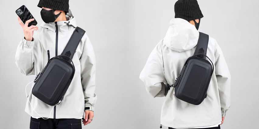 Sleek crossbody sling bag with built-in USB charging port and headphone jack pass-through. Water-resistant fabric with multiple compartments for tablet, phone, and accessories. Ideal for tech-forward corporate gifting and trade show giveaways.