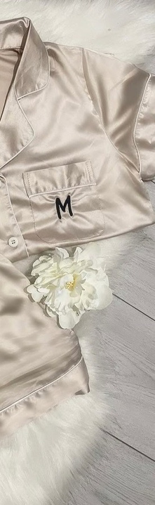 Luxurious satin pyjama set with custom monogram embroidery. Perfect for bridal parties, VIP gifting, and luxury brand merchandise. Presented in a branded gift box.