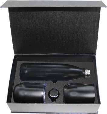 Matching drinkware duo in an elegant presentation box. Includes a 500ml water bottle and a 350ml tumbler in coordinating colours and finishes. Both items laser-engraved with your branding for a cohesive premium gift.