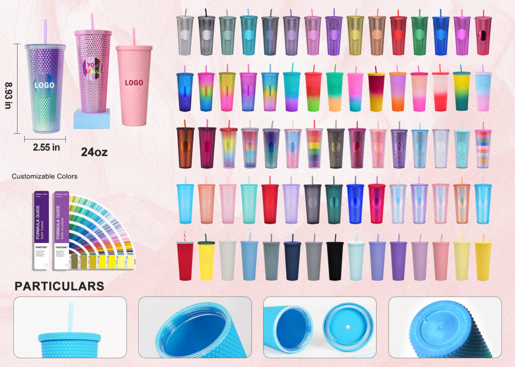 Eye-catching studded texture cold cup with matching straw and lid. Available in solid, gradient, and iridescent finishes. Popular for lifestyle brands, cafés, and event merchandise. Double-wall acrylic keeps drinks cold.