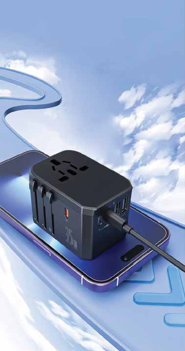 Universal travel adapter compatible with 150+ countries. Features dual USB-A ports and slide-out plug configurations for US, UK, EU, and AU sockets. Compact design with branded logo area. Essential corporate travel gift.