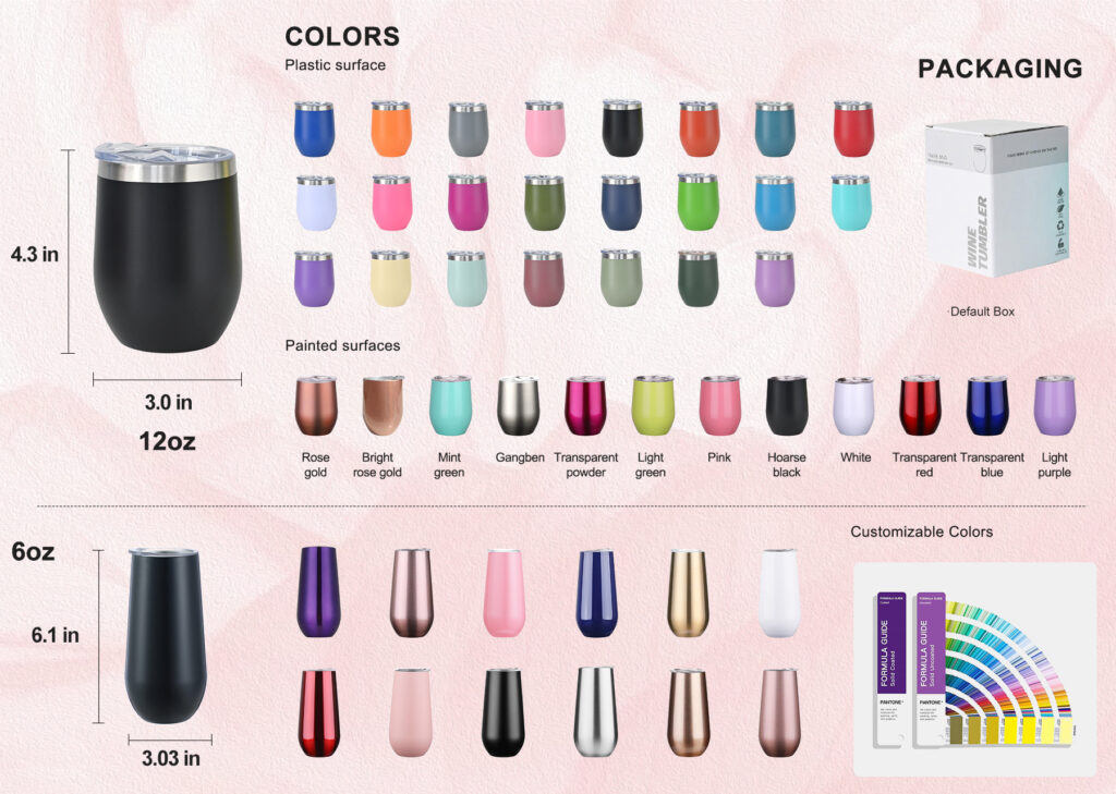 Stemless insulated wine tumbler with clear press-fit lid. Available in 6oz (champagne flute style) and 12oz (standard wine) sizes. Perfect for events, hospitality branding, and luxury corporate gifts. Metallic finishes available.